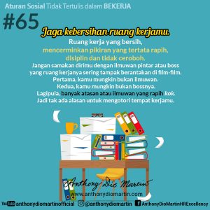 65. Jaga kebersihan ruang kerjamu. Ruang kerja yang bersih, mencerminkan pikiran yang tertata rapih, disiplin dan tidak ceroboh. Jangan samakan dirimu dengan ilmuwan pintar atau boss yang ruang kerjanya sering tampak berantakan di film-film. Pertama, kamu mungkin bukan ilmuwan. Kedua, kamu mungkin bukan bossnya. Lagipula, banyak atasan atau ilmuwan yang rapih kok. Jadi tak ada alasan untuk mengotori tempat kerjamu.