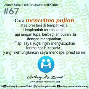 67. Cara menerima pujian atas prestasi di tempat kerja. Ucapkanlah terima kasih. Tapi jangan lupa, berbagilah pujian itu dengan mengatakan, “Tapi saya juga ingin mengucapkan terima kasih kepada….. yang memungkinkan saya mencapai prestasi ini!”