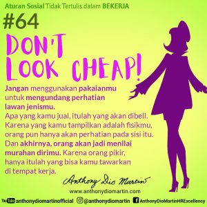 64. Don’t look cheap! Jangan menggunakan pakaianmu untuk mengundang perhatian lawan jenismu. Apa yang kamu jual, itulah yang akan dibeli. Karena yang kamu tampilkan adalah fisikmu, orang pun hanya akan perhatian pada sisi itu. Dan akhirnya, orang akan jadi menilai murahan dirimu. Karena orang pikir, hanya itulah yang bisa kamu tawarkan di tempat kerja.