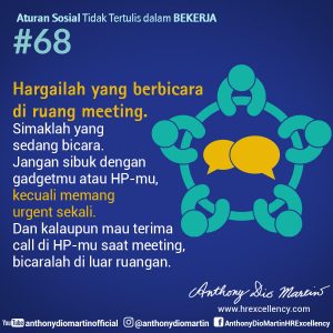 68. Hargailah yang berbicara di ruang meeting. Simaklah yang sedang bicara. Jangan sibuk dengan gadgetmu atau HP-mu, kecuali memang urgent sekali. Dan kalaupun mau terima call di HP-mu saat meeting, bicaralah di luar ruangan.