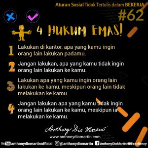 62. 4 HUKUM EMAS! (1) Lakukan di kantor, apa yang kamu ingin orang lain lakukan padamu. (2) Jangan lakukan, apa yang kamu tidak ingin orang lain lakukan ke kamu. (3) Lakukan apa yang kamu ingin orang lain lakukan ke kamu, meskipun orang lain tidak melakukan ke kamu. (4) Jangan lakukan apa yang kamu tidak orang lain lakukan ke kamu, meskipun ia melakukan ke kamu.