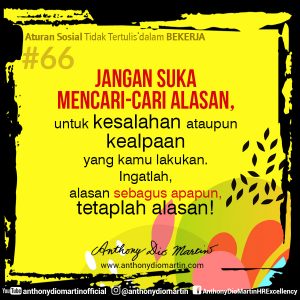66. Jangan suka mencari-cari alasan, untuk kesalahan ataupun kealpaan yang kamu lakukan. Ingatlah, alasan sebagus apapun, tetaplah alasan!