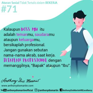 71. Kalaupun bossmu itu adalah temanmu, saudaramu ataupun keluargamu, bersikaplah profesional. Jangan gunakan sebutan nama-nama akrab, saat kerja. Tetaplah professional dengan memanggilnya, “Bapak” ataupun “Ibu”.