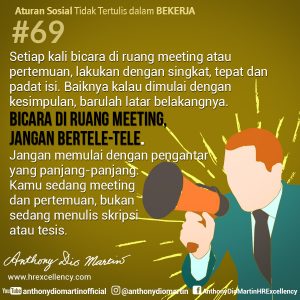 69. Setiap kali bicara di ruang meeting atau pertemuan, lakukan dengan singkat, tepat dan padat isi. Baiknya kalau dimulai dengan kesimpulan, barulah latar belakangnya. Bicara di ruang meeting, jangan bertele-tele. Jangan memulai dengan pengantar yang panjang-panjang. Kamu sedang meeting dan pertemuan, bukan sedang menulis skripsi atau tesis.