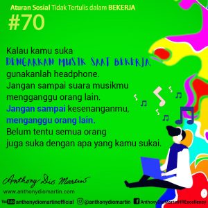 70. Kalau kamu suka dengarkan musik saat bekerja, gunakanlah headphone. Jangan sampai suara musikmu mengganggu orang lain. Jangan sampai kesenanganmu, menganggu orang lain. Belum tentu, semua orang juga suka dengan apa yang kamu sukai.