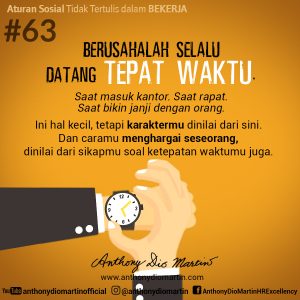 63. Berusahalah selalu datang tepat waktu. Saat masuk kantor. Saat rapat. Saat bikin janji dengan orang. Ini hal kecil, tetapi karaktermu dinilai dari sini. Dan caramu menghargai seseorang, dinilai dari sikapmu soal ketepatan waktumu juga.