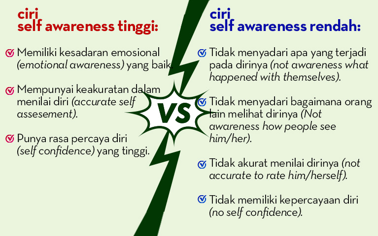 So, dari penjelasan di atas, pertanyaannya apakah Anda memiliki self awareness yang baik, ataukah jangan-jangan Anda memiliki ciri-ciri self awarenesss yang rendah. Berita baiknya adalah, self awareness ini bisa dilatih dan dikembangkan. So, belajar kembangkan dan latih self awareness Anda!