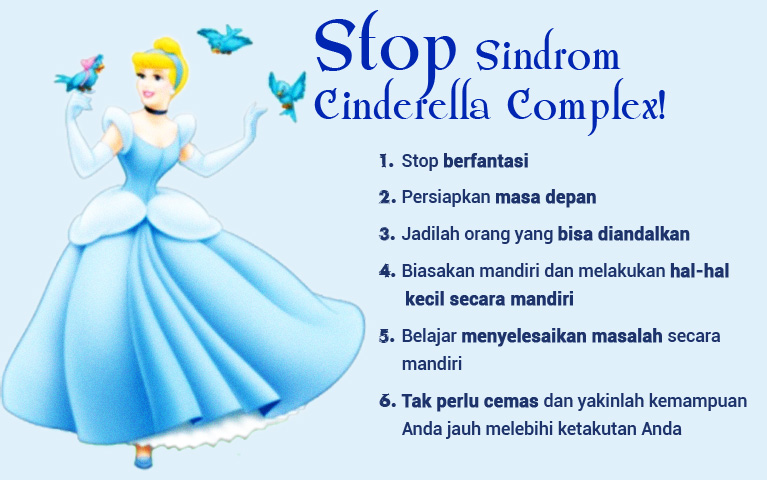 Itulah simtom-simtom yang mendekati gambaran yang oleh Colette Dowling dalam bukunya yang diterbitkan tahun 1981 yang berjudul “The Cinderella Complex: Women’s Hidden Fear of Independence”. Buku ini pada dasarnya berkisah soal kecenderungan pada beberapa wanita dewasa, yang berperilaku tidak matang, karena ketakutan mereka untuk menjadi mendiri. Dan realitasnya, meskipun saat ini banyak wanita metropolitan yang tampak independen, karirnya bagus dan sukses, ternyata banyak yang mengalami kecemasan, rapuh tapi terus-menerus men-fantasikan hadirnya figur pendamping.