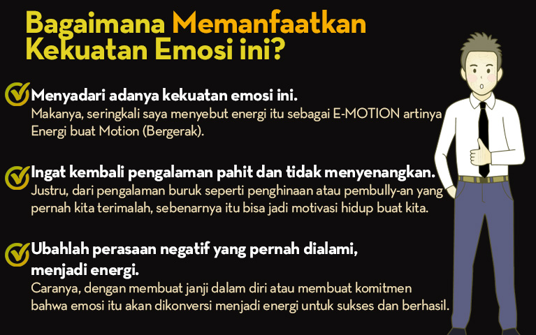 Ketiga, ubahlah perasaan negatif yang pernah dialami, menjadi energi. Caranya, dengan membuat janji dalam diri atau membuat komitmen bahwa emosi itu akan dikonversi menjadi energi untuk sukses dan berhasil.