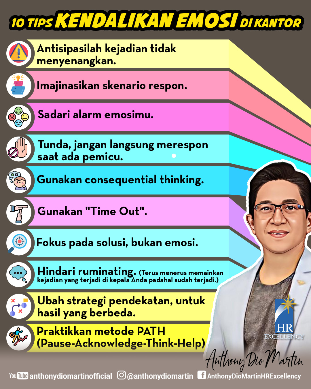 Nah, semoga dengan mempraktekkan ke-10 tips cerdas emosi itu, kita belajar jadi jauh lebih bijak menyikapi berbagai kejadian buruk, yang mungkin akan kita hadapi di kantor. Ingat, bukan kejadiannya tapi respon kitalah yang akan menentukan hasil serta output yang akan kita peroleh!