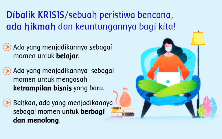 Sekarang kembali kepada diri kita sendiri. Di balik wabah coronavirus yang telah merenggut nyawa banyak orang ini, juga terdapat benih-benih pembelajaran buat kita. Daripada menjadi stress, bingung ataupun panik menyaksikan dan merasakan wabah ini dialami dalam kehidupan kita. Kita pun bisa melihat dari sisi lain. Sisi hikmah dan pembelajaran yang berbeda-beda bagi setiap dari kita, yang mau membuka mata dan pikiran kita. Ada yang justru melihat ini sebagai momen berharga bagi keluarganya. Ada yang menjadikan ini sebagai momen untuk belajar. Ada yang menjadikan ini sebagai momen untuk mengasah ketrampilan bisnis yang baru. Bahkan, ada yang menjadikan ini sebagai momen untuk berbagi dan menolong.