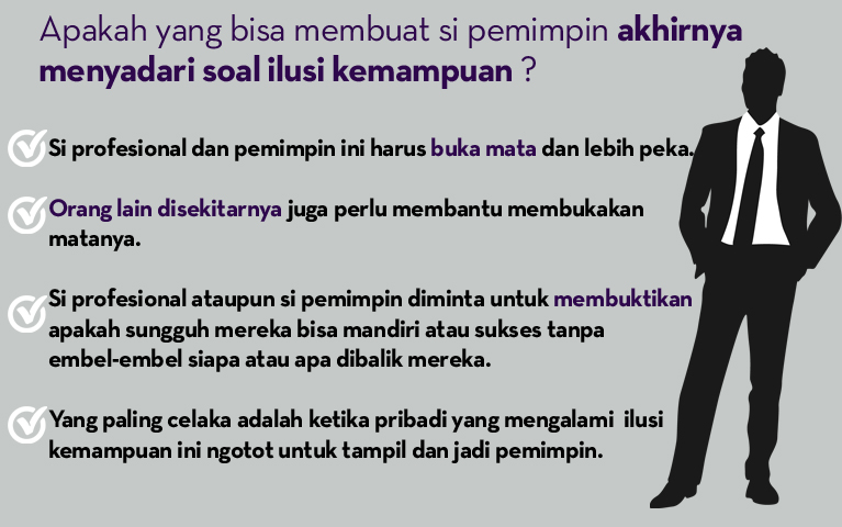 Pertama, si profesional dan pemimpin ini harus buka mata dan lebih peka. Ia perlu bertanya apakah selama ini, ia memang memiliki kemampuan ataukah jangan-jangan orang bukan melihat dirinya tapi semata-mata pada dimana atau kepada siapa ia menempel. Semakin cepat ia sadar dan buka mata, semakin ia terbebas dari ilusi kemampuan itu. Jika tidak ia akan jadi bulan-bulanan bahkan bahan tertawaan orang.