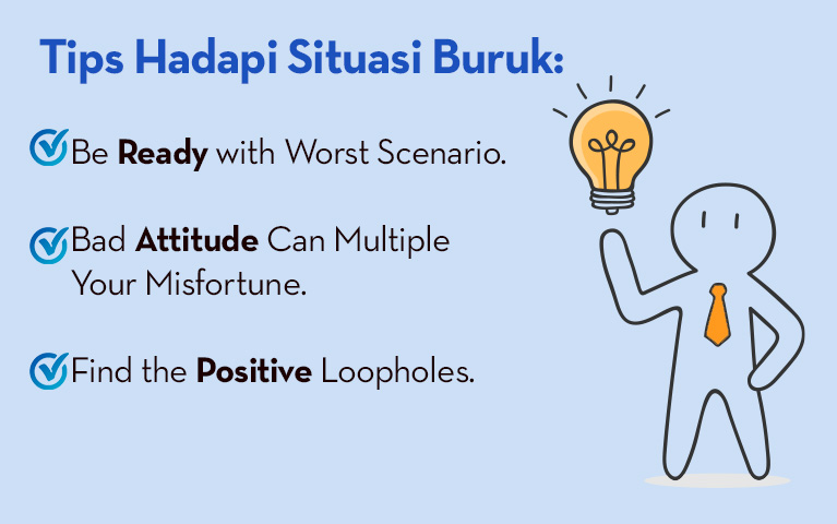 1. Be Ready with Worst Scenario. Bersiaplah dengan skenario terburuk. Umumnya, yang mengalami depresi berat, dan jatuh mentalnya, adalah yang tidak siap dengan skenario terburuk. Mereka berharap terlalu tinggi. Jadi, saat hal terburuk terjadi mereka tidak siap. Alangkah lebih baik, Anda juga siapkan skenario terburuk yang bisa terjadi. Sehingga saat hal buruk itu terjadi, Anda pun tidak kaget.