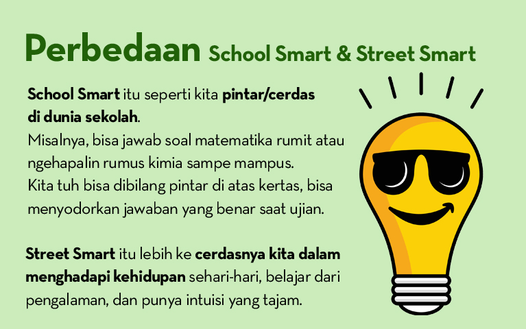 Nggak ada salahnya selain memiliki School Smart, tapi kita juga perlu memiliki Street Smart. Contohnya, belajarlah dari pengalaman orang lain, dari kesalahan kita sendiri, dan terapkan ilmu itu di kehidupan nyata. Ternyata, kita menggabungkan antara kecerdasan di sekolah dan di jalanan. Saling melengkapi, bukan saling menggantikan.