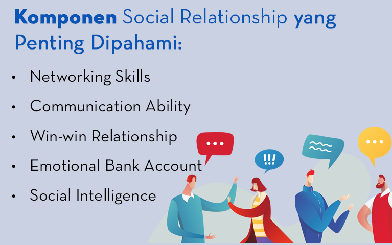 Social Relationship adalah kemampuan seseorang untuk menyadari pentingnya interaksi dengan orang lain, lantas memiliki kesanggupan untuk mengerti, menggunakan dan mengaplikasikan berbagai cara dalam berinteraksi dengan orang lain tersebut. Dampak dari hubungan relasi yang bagus adalah keharmonisan dan tabungan emosional yang tinggi dengan orang disekelilingnya.